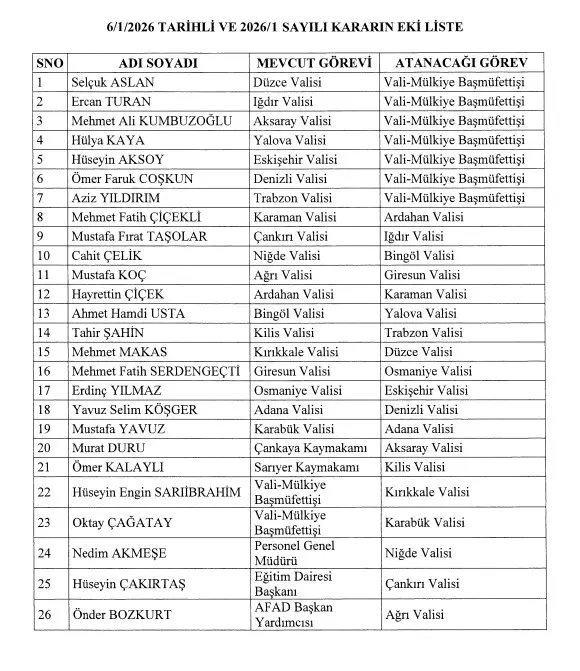 Diğer illerdeki vali değişiklikleri ise şu şekilde gerçekleşti: