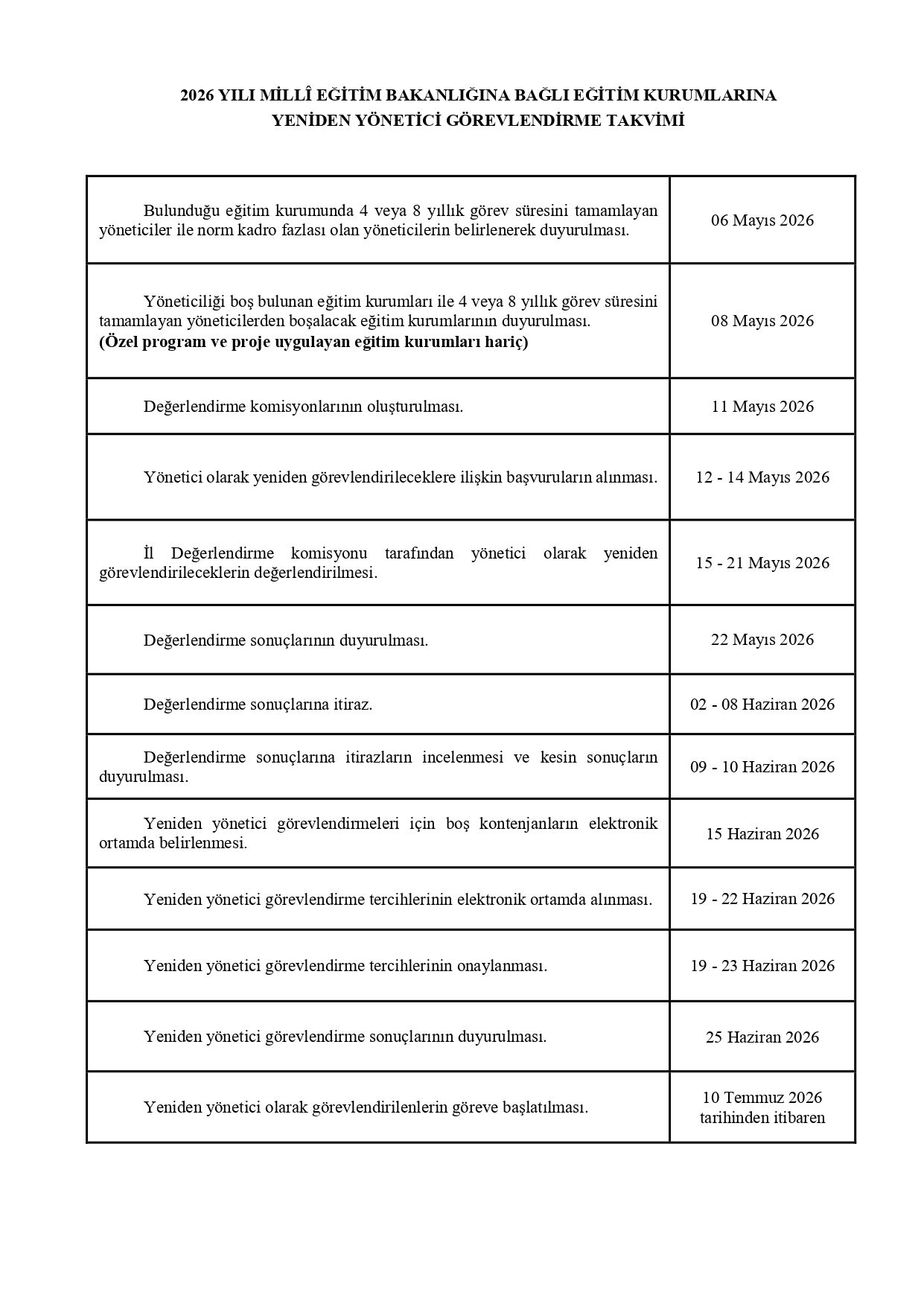 Millî Eğitim Bakanlığı Eğitim Kurumları Yönetici Görevlendirme Yönetmeliği çerçevesinde hazırlanan 2026 Yılı Millî Eğitim Bakanlığına Bağlı Eğitim Kurumlarına Yeniden Yönetici Görevlendirme Takvimi