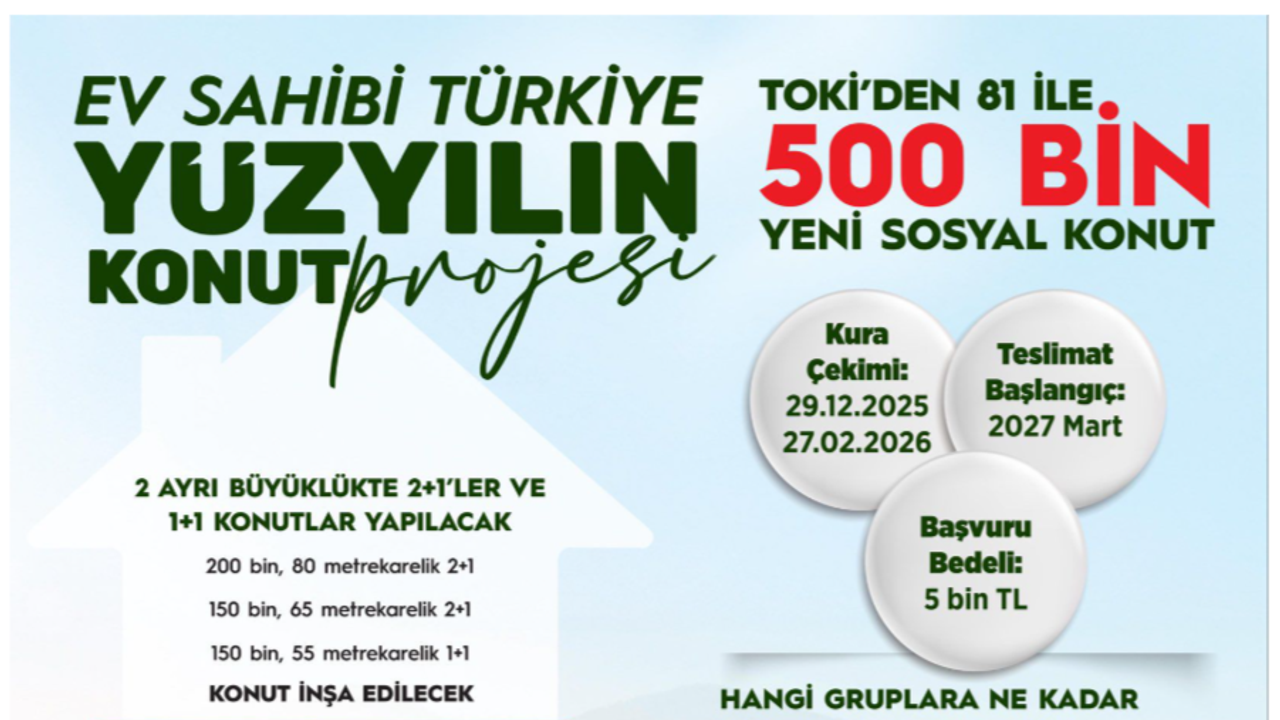 Başvurular Ziraat, Halkbank ve Emlak Katılım Bankaları üzerinden ve e-Devlet aracılığı ile yapılacak. Başvurular 10 Kasım-19 Aralık 2025 toplanacak. Hak sahibi belirleme kuralarının çekimi 29 Aralık 2025-27 Şubat 2026 arasında yapılacak. Konutlar Mart 2027 itibarıyla teslim edilmeye başlayacak.