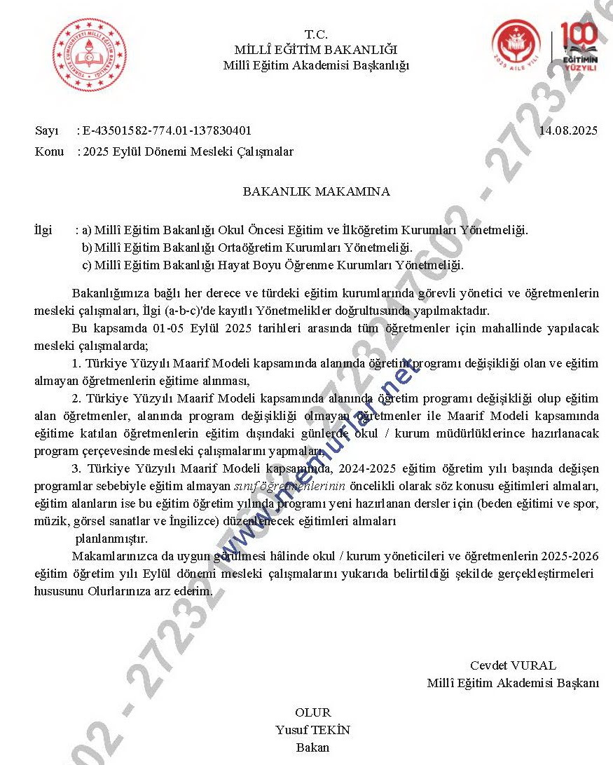 Milli Eğitim Bakanlığı'nın Milli Eğitim Akademisi Başkanlığı, 14.08.2025 tarihinde yayımladığı 137830401 sayılı yazı ile 2025 Eylül Dönemi Mesleki Çalışmalarının detaylarını duyurdu.