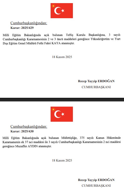 Milli Eğitim Bakanlığında açık bulunan Teftiş Kurulu Başkanlığına, Yükseköğretim ve Yurt Dışı Eğitim Genel Müdürü Fethi Fahri Kaya getirilirken Bakanlıkta açık bulunan Müfettişliğe ise Muzaffer Aydın atandı.