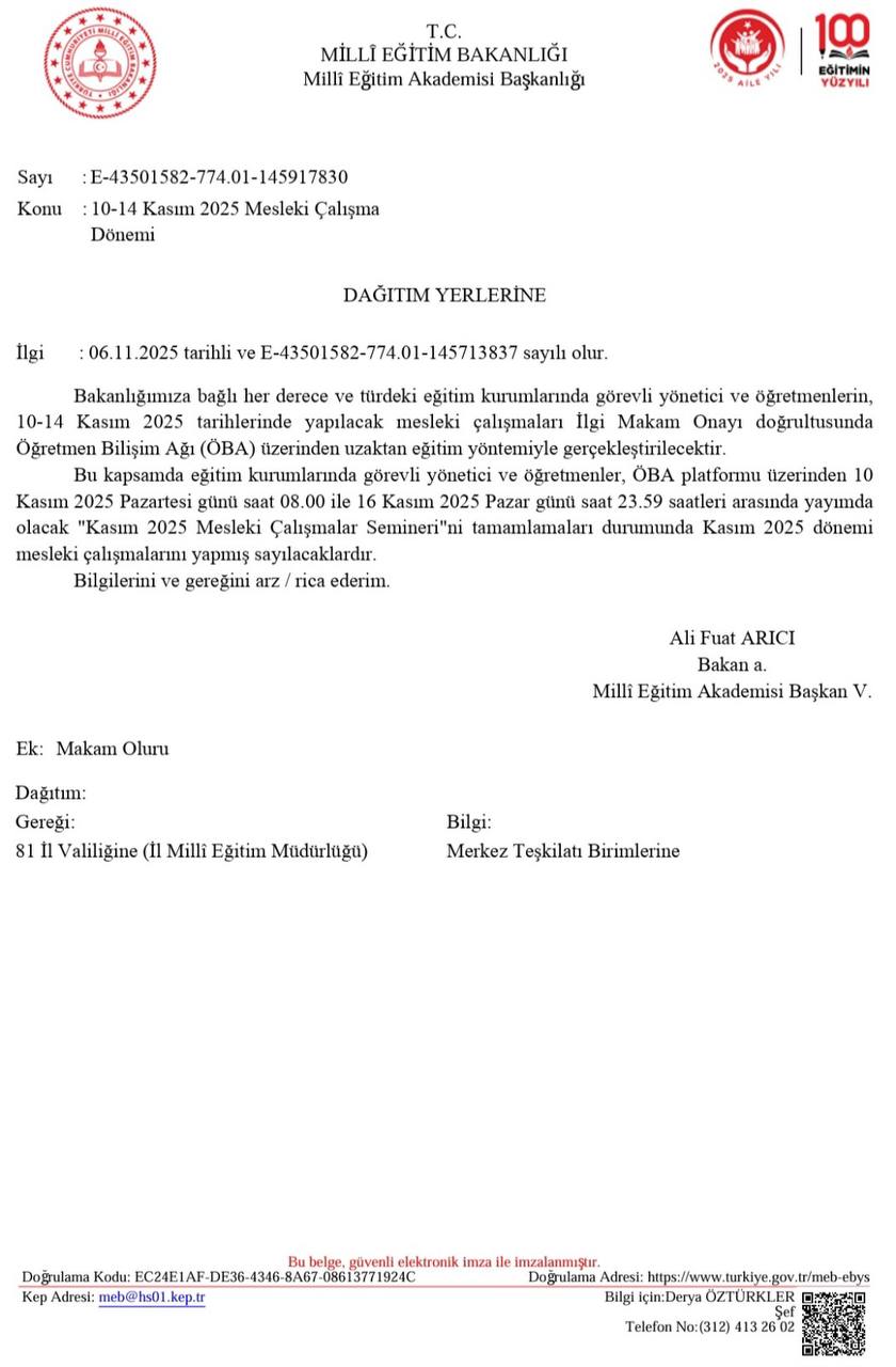 10-14 Kasım 2025 Mesleki Çalışma Dönemi Resmi Yazı ve Konuları Süre (Saat)